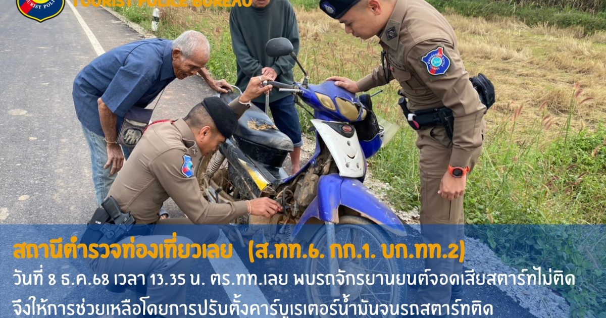 ตร.ทท.เลย ขณะ ว.4 ออกตรวจในเขตพื้นที่รับผิดชอบ พบรถจักรยานยนต์ประชาชนจอดเสียอยู่ข้างถนน บริเวณถนนเส้น 2250 บ้านผาบิ้ง อ.วังสะพุง จ.เลย ตร.ทท.เลย เข้าไปสอบถามทราบว่า รถจักรยานยนต์สตาร์ทไม่ติด จึงได้ให้การช่วยเหลือโดยการปรับตั้งคาร์บูเรเตอร์น้ำมันจนรถสตาร์ทติดอีกครั้ง ทำให้สามารถเดินทางต่อไปได้