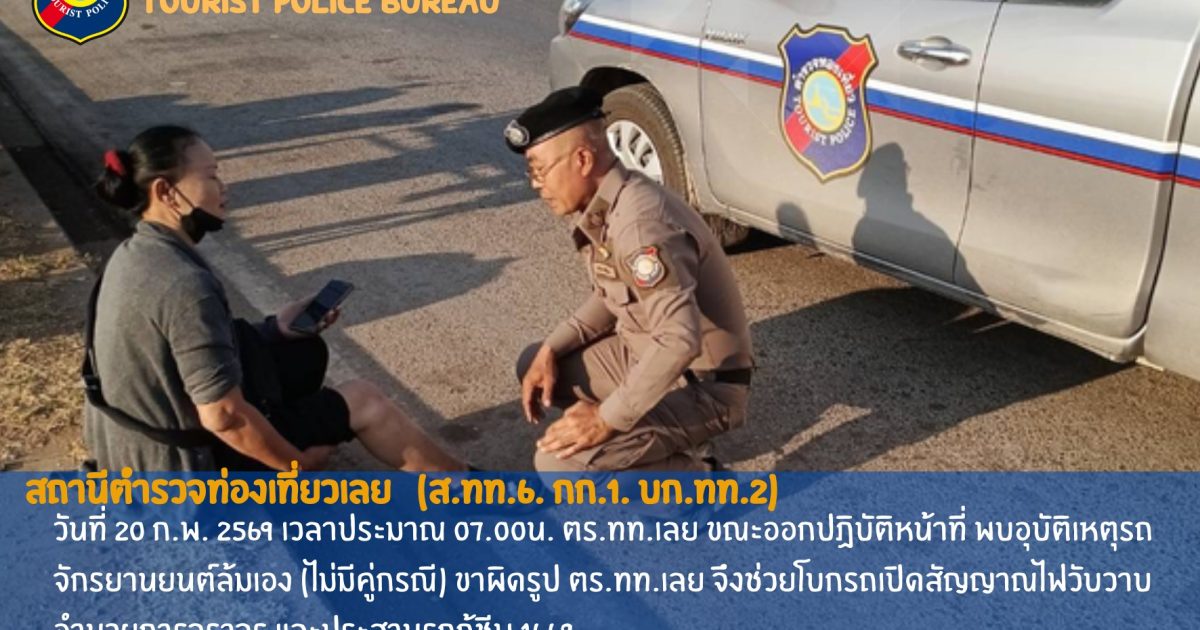 ตร.ทท.เลย (ประจำหนองบัวลำภู) ออกปฏิบัติหน้าที่ในเขตพื้นที่รับผิดชอบได้มาถึงบริเวณ หน้าตลาดเช้า อำเภอเมือง จังหวัดหนองบัวลำภู พบอุบัติเหตุ จยย.ล้มเอง (ไม่มีคู่กรณี) ขาผิดรูป ตร.ทท.เลย จึงช่วยโบกรถเปิดสัญญาณไฟวับวาบ อำนวยการจราจร และประสานรถกู้ชีพ 1669