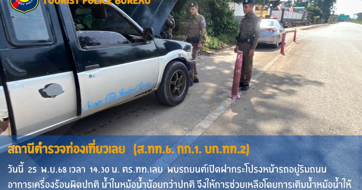 ตร.ทท.เลย ออกปฏิบัติหน้าที่ในเขตพื้นที่รับผิดชอบได้ ว.4 พบรถยนต์เปิดฝากระโปรงหน้ารถ อยู่ริมถนนบริเวณถนนสายภูบ่อบิด – ห้วยพอด อ.เมือง จ.เลย จึงเข้าไปสอบถามพบว่ารถยนต์คันดังกล่าว มีอาการเครื่องร้อนผิดปกติ ตรวจสอบหม้อนํ้า ปรากฏว่านํ้าในหม้อนํ้าน้อยกว่าปกติ ตร.ทท.เลย ให้การช่วยเหลือโดยการเติมนํ้าหม้อนํ้าให้กับประชาชน ทำรถให้สตาร์ทติด และเครื่องยนต์กลับมาทำงานปกติสามารถเดินทางต่อไปได้