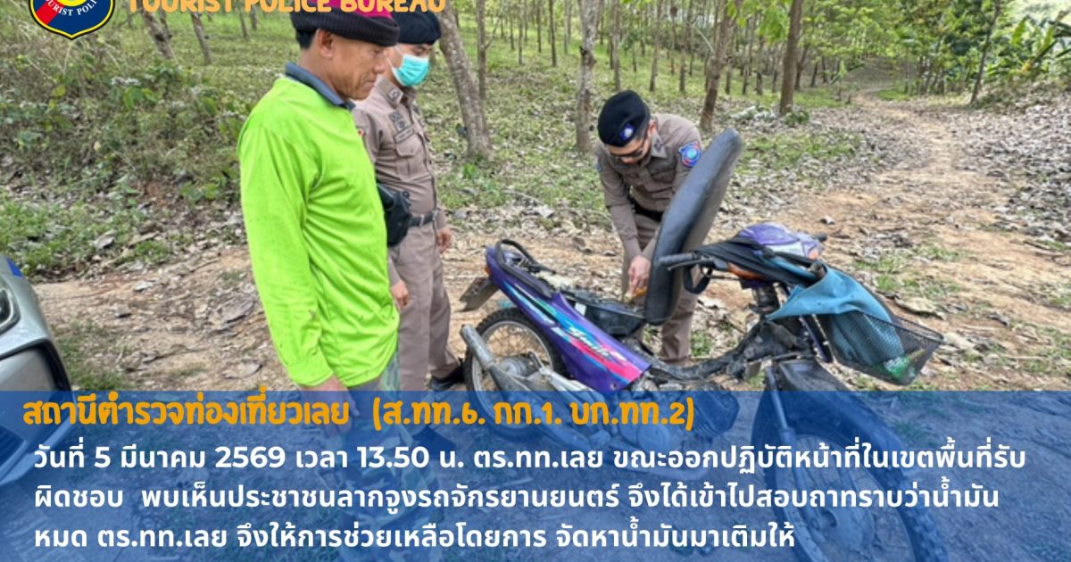 ตำรวจท่องเที่ยวเลยได้ออกตรวจพื้นที่ (ว.4) ในเขตพื้นที่รับผิดชอบ ระหว่างปฏิบัติหน้าที่บริเวณ ป่ายางข้างถนนแถวบ้านปากภู อำเภอเมือง จังหวัดเลย ได้พบประชาชนกำลังลากจูงรถจักรยานยนต์อยู่ข้างทาง เข้าไปสอบถาม ทราบว่าน้ำมันหมด จึงให้การช่วยเหลือโดยการจัดหาน้ำมันมาเติมให้ เพื่อให้ประชาชนสามารถเดินทางต่อไปได้อย่างปลอดภัย
