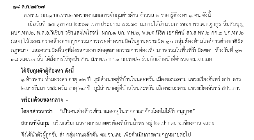 ระดมกวาดล้างอาชญากรรมการกระทำความผิดในฐานความผิด 10 กลุ่มต้องห้ามไกด์ชาวต่างชาติผิดกฎหมาย และความผิดอื่นๆที่ส่งผลกระทบต่ออุตสาหกรรมการท่องเที่ยวภาพรวมในพื้นที่รับผิดชอบ ห้วงวันที่ 12-18 ต.ค.67
