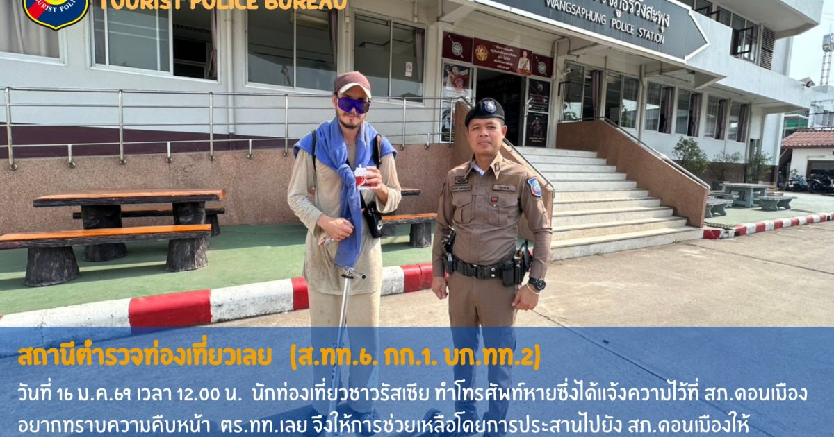 ได้รับการประสานจาก สภ.วังสะพุง อ.วังสะพุง จ.เลย ขอสนับสนุนล่ามแปล กรณีนักท่องเที่ยวชาวรัฐเซีย เดินทางมาสอบถามความคืบหน้ากรณีโทรศัพท์หาย ซึ่งได้แจ้งความไว้ที่ สภ.ดอนเมือง และอยากทราบความคืบหน้าว่าเป็นอย่างไร ตร.ทท.เลย จึงให้การช่วยเหลือโดยประสานไปยังสภ.ดอนเมือง และอธิบายให้ นทท.ทราบว่าอยู่ระหว่างขั้นตอนใด